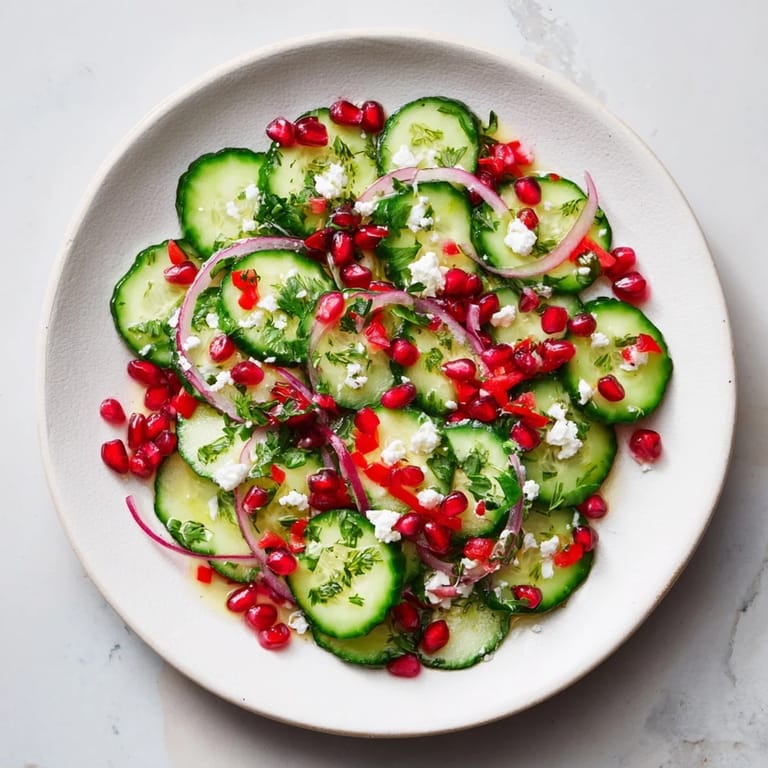 Save to Pinterest A fresh, festive salad featuring crisp cucumbers, vibrant pomegranate seeds, and a tangy citrus dressing—perfect for holiday gatherings.