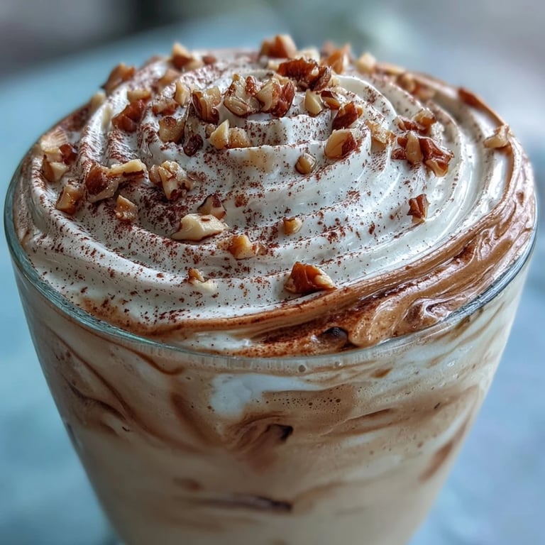 - Top with a generous dollop of whipped cream, dust lightly with hojicha powder so it looks intentional, and scatter those crushed nuts around the cream. Slide a straw in and serve right away while everything is at its coldest.