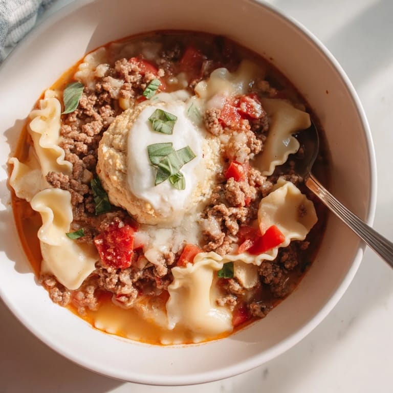 Save to Pinterest A comforting fusion of classic lasagne flavors in a hearty soup, topped with golden cheesy biscuit melts. Perfect for cozy family dinners.