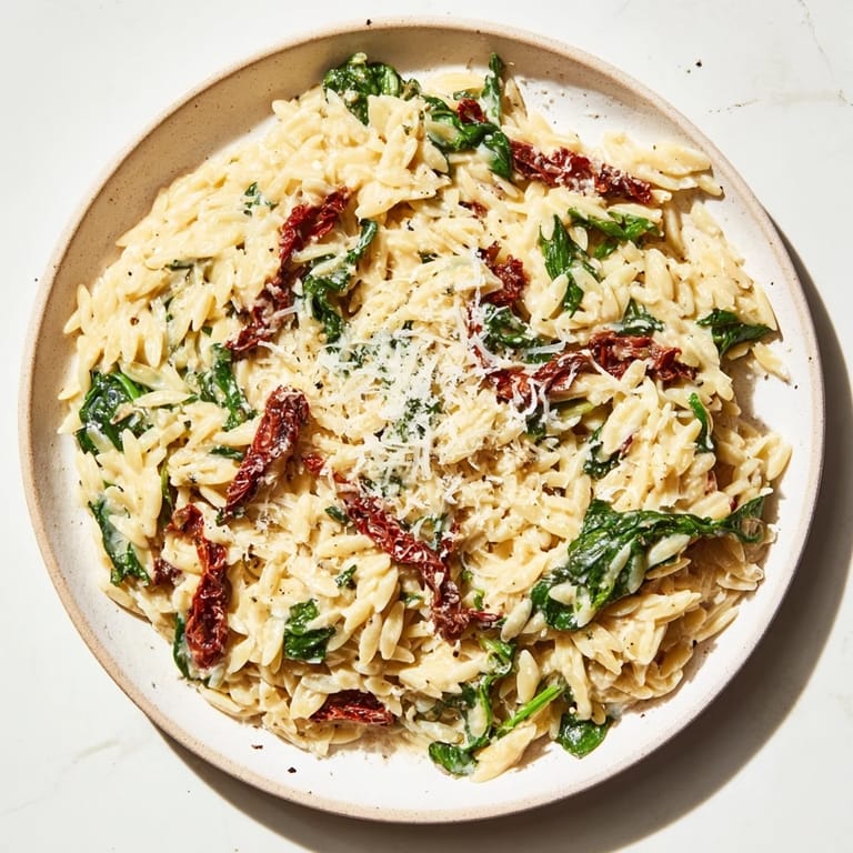 Save to Pinterest A rich and comforting bowl of orzo pasta simmered in a creamy garlic:Parmesan sauce with sun-dried tomatoes, spinach, and a hint of Italian herbs. Perfect for a satisfying vegetarian meal.