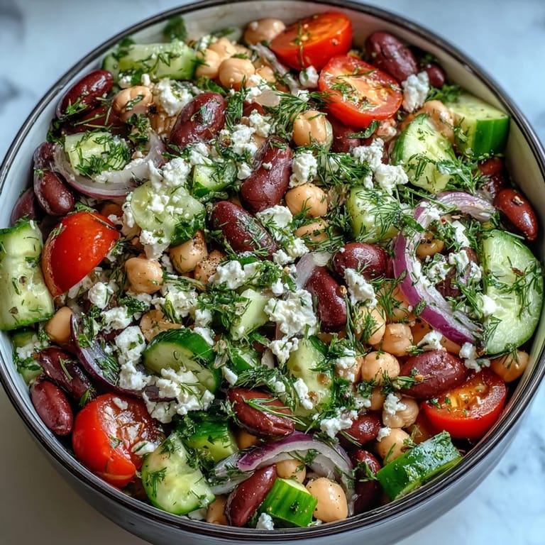Save to Pinterest The first time I made this bean salad was for a last-minute backyard gathering, and I was honestly worried it might feel too simple. But watching friends go back for third servings, scraping the bowl clean, taught me that sometimes the most vibrant dishes come from humble ingredients and a bright, zesty dressing. Now whenever I need something that feels festive without requiring hours at the stove, this Mediterranean medley is my go-to.