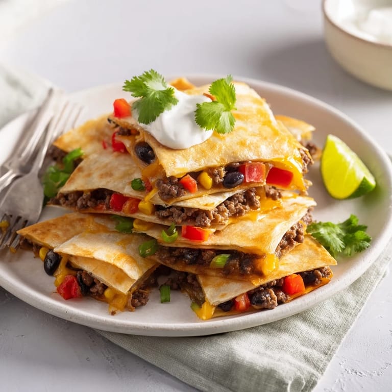 Save to Pinterest Crispy, golden quesadillas filled with seasoned beef, melted cheese, and colorful vegetables baked on a sheet pan for an easy, crowd-pleasing meal.