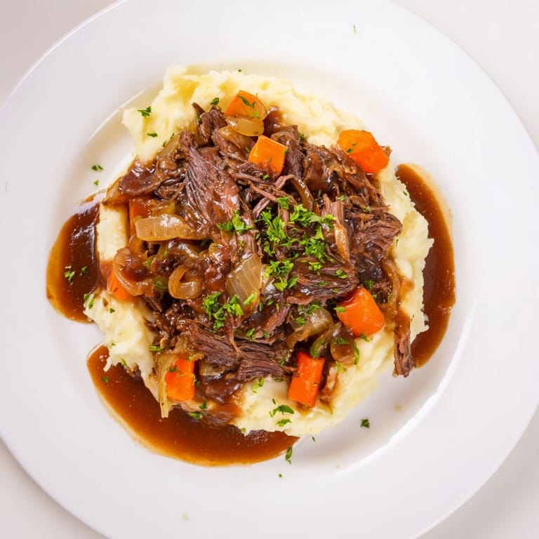 Save to Pinterest A classic, comforting dish featuring tender beef pot roast slow-cooked with vegetables and rich gravy, served alongside creamy mashed potatoes.