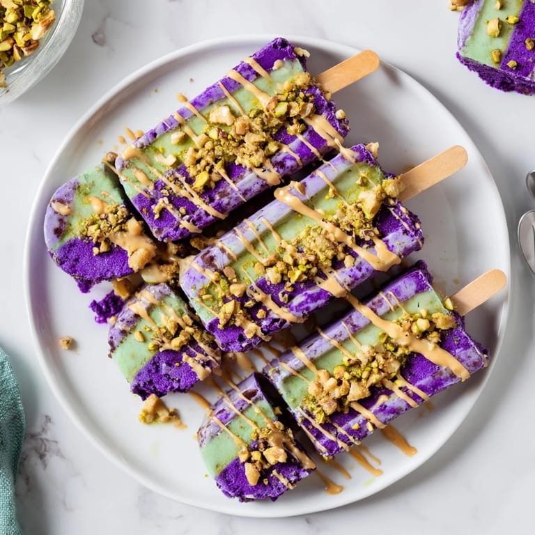 Save to Pinterest Creamy, vibrant ice cream bars featuring sweet ube and nutty pistachio, layered for a delightful contrast in flavor and color. Perfect for a refreshing summer dessert or an impressive treat for gatherings.