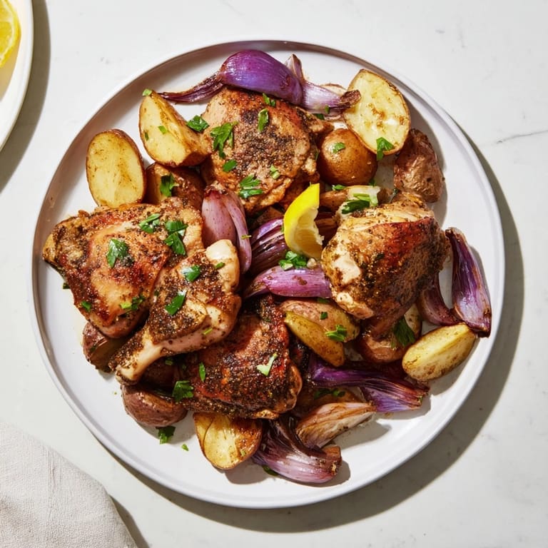 Save to Pinterest A vibrant, Middle Eastern-inspired sheet pan dinner featuring juicy zaatar-spiced chicken thighs and crispy roasted potatoes, all cooked together for maximum flavor and minimal cleanup.